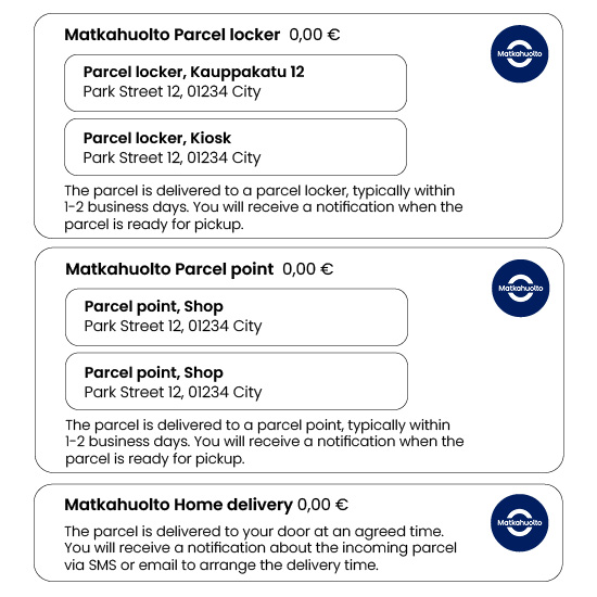 Below are examples of how delivery methods should be displayed in the online store checkout. Views may vary depending on the e-commerce platform in use and whether the Matkahuolto parcel point integration is enabled.