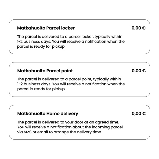 Delivery method descriptions vary depending on the online store platform and whether Matkahuolto’s parcel point integration is used. Despite these differences, strive to describe the delivery options as clearly and informatively as possible for the customer. With Matkahuolto’s parcel point integration, parcel point details are automatically displayed to the end customer. Instructions for implementing the interface in the online store view can be found on our website.