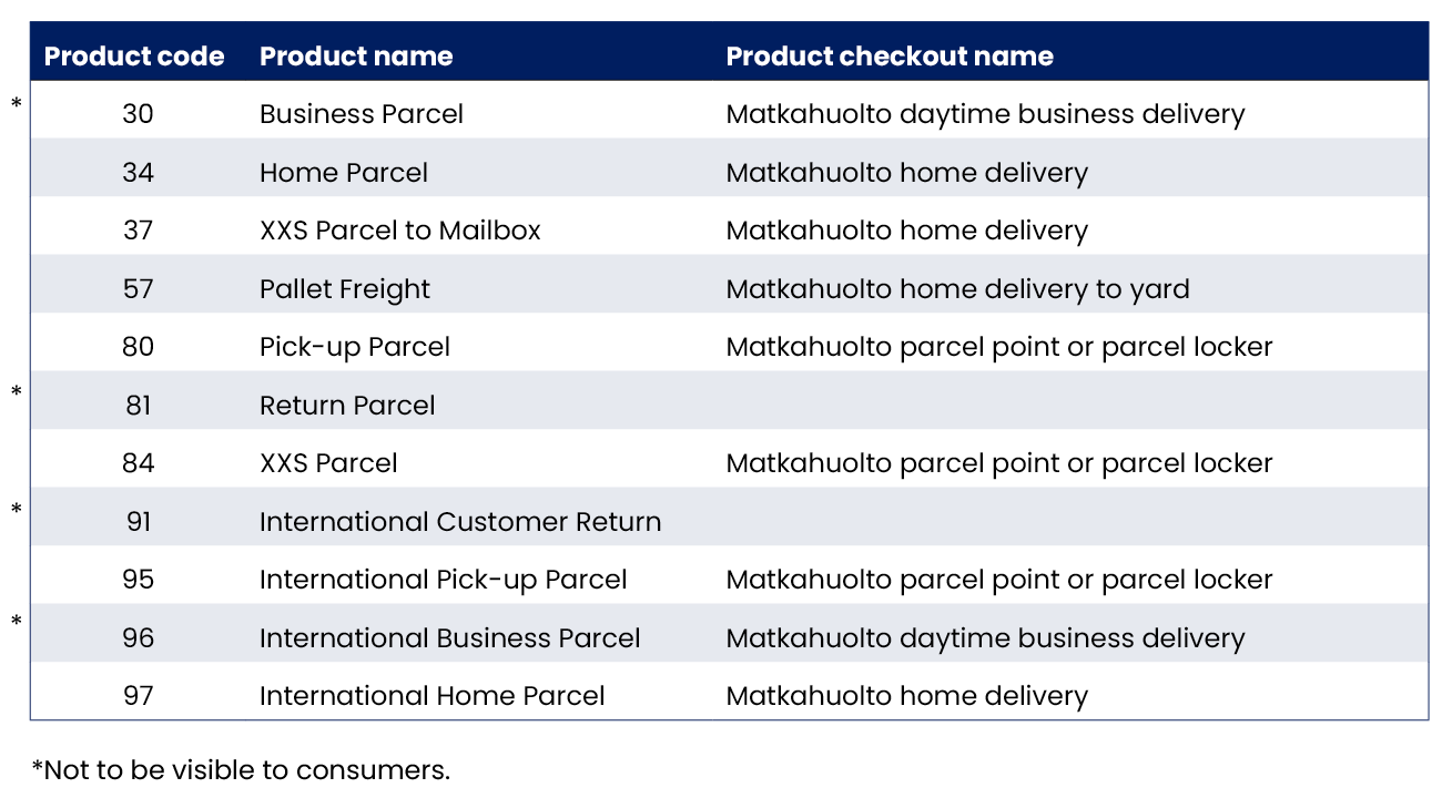 Product names like Pick-up Parcel or Home Parcel should not be visible to the end customer. For the end customer, use the description Matkahuolto parcel point or parcel locker for Pick-up Parcel and Matkahuolto home delivery for Home Parcel.